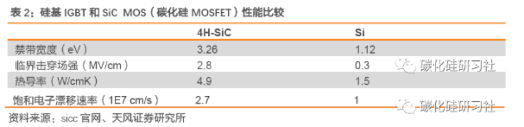 碳化硅(SiC)作为宽禁带半导体材料,相对于Si基器件具有禁带宽度大、击穿电场高、热导率高、电子饱和速率高、抗辐射能力强等特点,在高频、高压、高温等工作场景中,有易散热、小体积、低能耗、 高功率等明显优势。