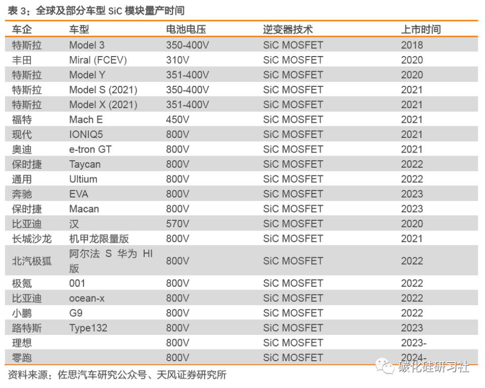 2021-2022年,现代IONIQ5、奥迪e-tron GT、保时捷Taycan等国外车型,以及长城沙龙机甲龙、北汽极狐阿尔法S华为HI版、极氪001等国内车型已率先应用800V高压平台+SiC功率模块。2023年以后,更多基于800V架构的新能源汽车将进入量产阶段。根据英飞凌预计,到2025年汽车电子功率器件领域采用SiC技术的占比将会超过20%。