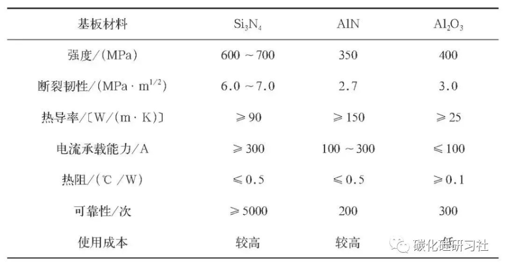三种陶瓷基板材料性能对比(来源:张伟儒,《第3代半导体碳化硅功率器件用高导热氮化硅陶瓷基板最新进展》