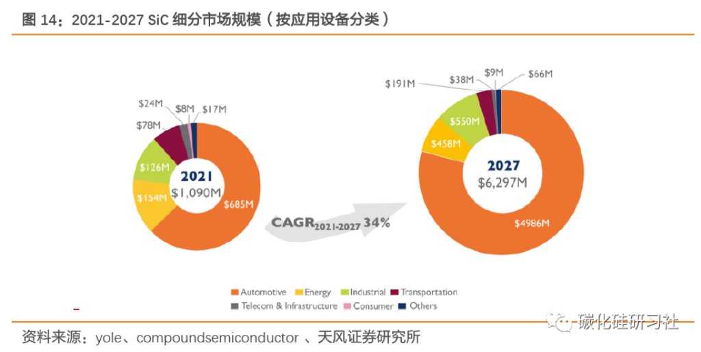 根据Yole数据,2021-2027年,全球 SiC 功率器件市场规模将由10.9亿美元增长到62.97亿美元,CAGR为34%;其中车用SiC市场规模将由6.85亿美元增长到49.86亿美元,CAGR 为39.2%,车(逆变器+OBC+DC/DC转换器)是SiC最大的下游应用,占比由62.8%增长到79.2%,市场份额持续提升。