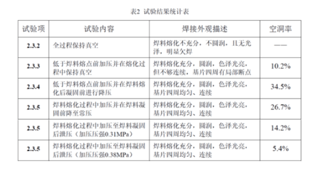 通过以上多组试验的检测结果,我们不难发现真空共晶焊接最关键的环节是在焊料达到熔点后以及降温凝固这个阶段,炉内氮气气压对空洞率的影响实际就是发生在这个环节。