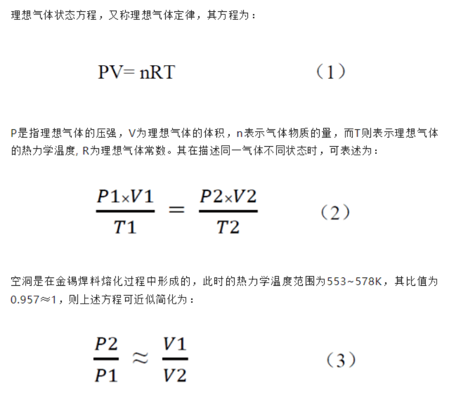 在金锡焊料熔化过程中,焊料达到熔点时的压强为P1,凝固后的压强为P2,当气压值减小时,空洞体积变大,与图5、图6所对应的试验结果相符;当气压值增大时,空洞体积变小,与图7、8所对应的试验结果相符。考虑到共晶焊接中影响空洞率的因素较多,上述推论可以反映空洞率发生变化的趋势。
