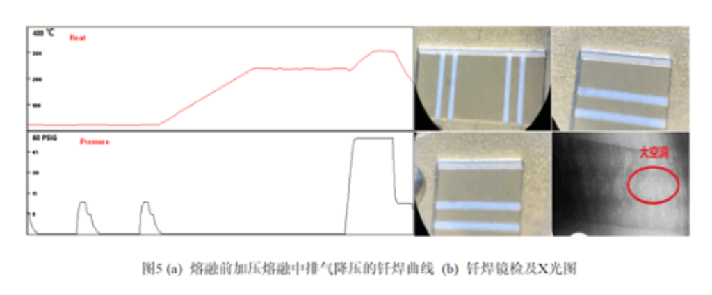 为了与熔融前加压熔融中保持真空的焊接做比对,尝试在熔融前加压并在熔融中进行排气降压进行试验,共晶焊接程序曲线如图5所示,该组试验件金锡焊料均熔化充分,色泽光亮,在X射线设备检测下空洞非常明显,其检测的空洞率值约为34.5%,呈恶化趋势,但是基片四周的焊料熔化连续。