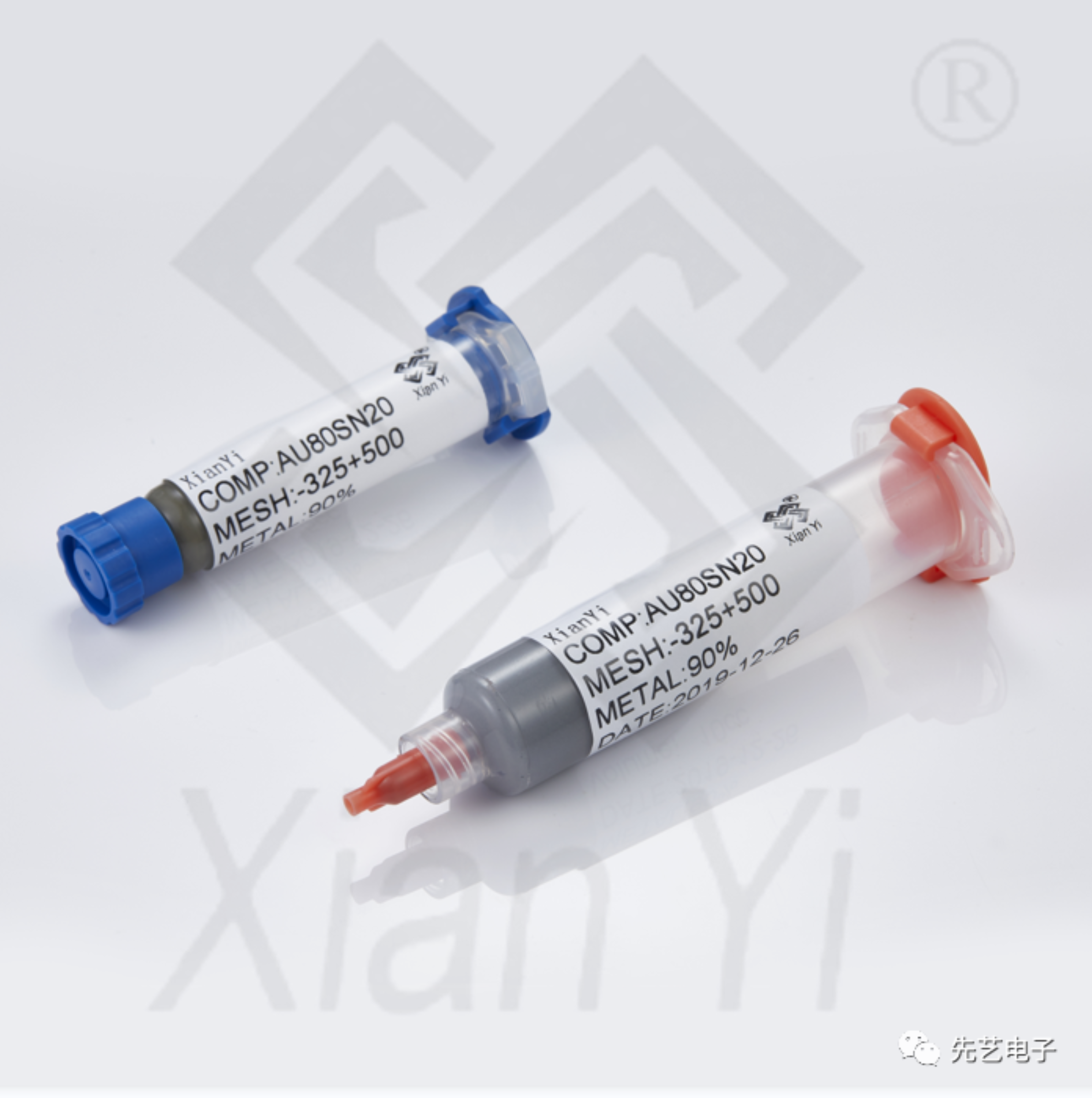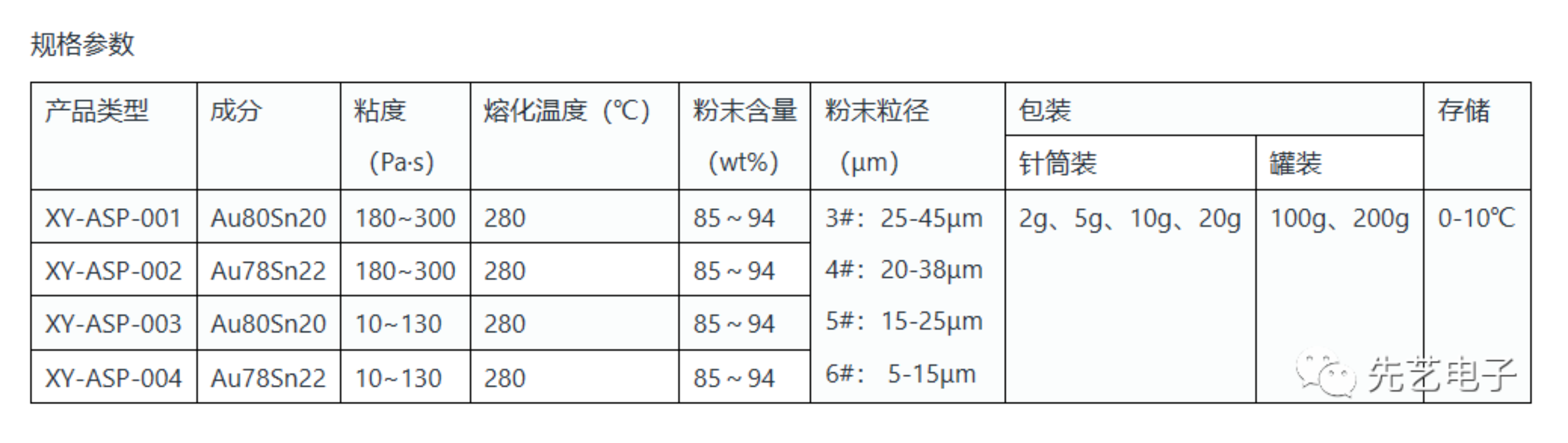 产品说明:金锡焊膏作为一种高可靠性高温焊膏,服役温度范围较高的场合,具有热疲劳性能好、在高温下强度高、抗腐蚀与抗氧化性能优异的特点。相较于金锡预成形焊片,在使用方式上更加灵活多样,适用于微型光电器件的高可靠性封装及大功率器件的高导热封装。