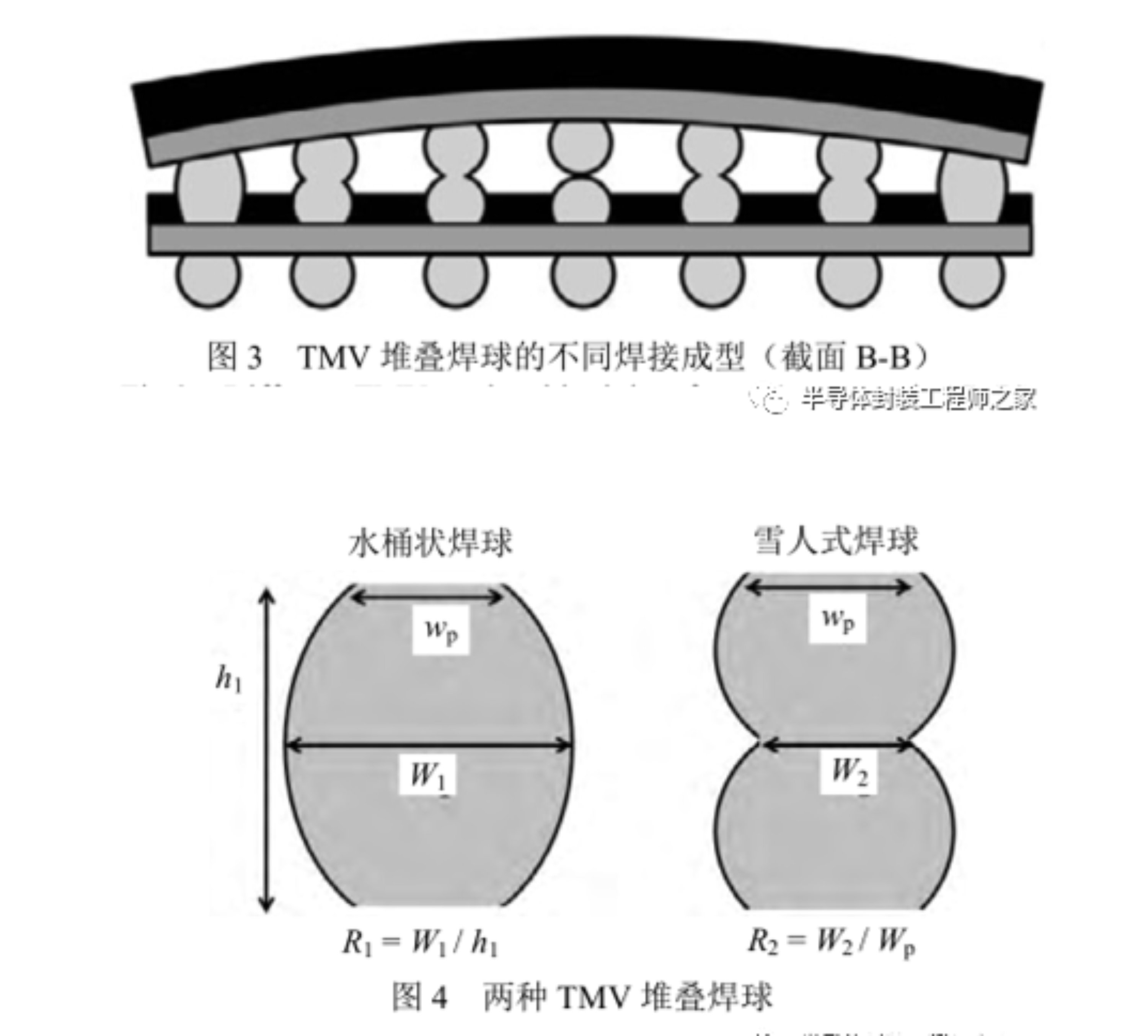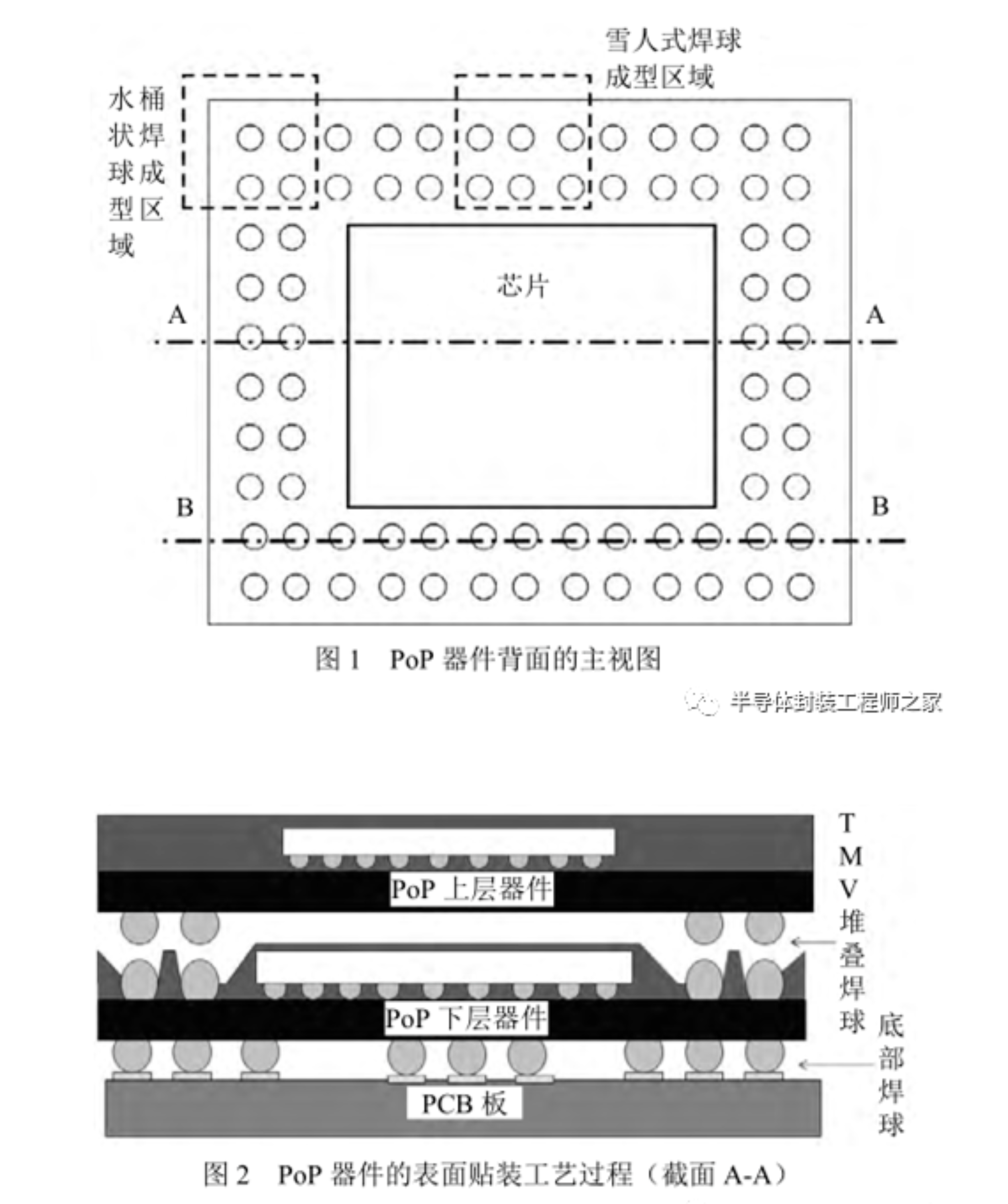 需要指出的是,为了便于读者阅读理解,图3的B-B截面示意图适当放大了器件的热翘曲度,并减少了焊球组数。实际中,PoP器件的热翘曲小于示意图中的变形量,而TMV的焊球数量也远不止7组,并且底部焊球还有填充胶的覆盖。