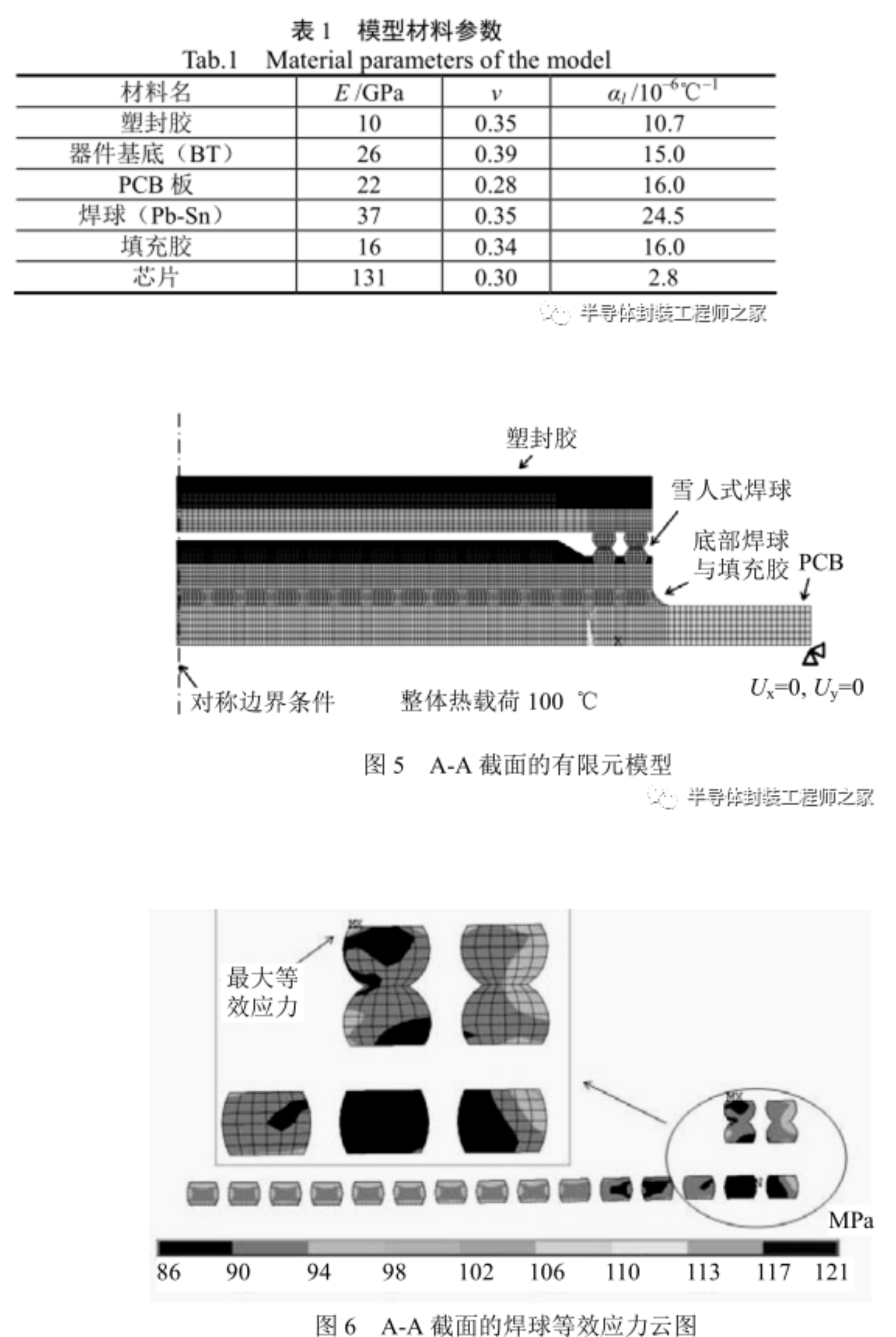 模型的材料属性如表1所示,A-A截面的有限元模型和边界条件等如图5所示。焊球的等效应力云图如图6所示。通过图6上下两排焊球的应力对比可以发现,雪人式焊球(上排)的应力集中比较底部焊球(下排)严重,而且最大等效应力出现在雪人式焊球与PoP上层器件的交界处。