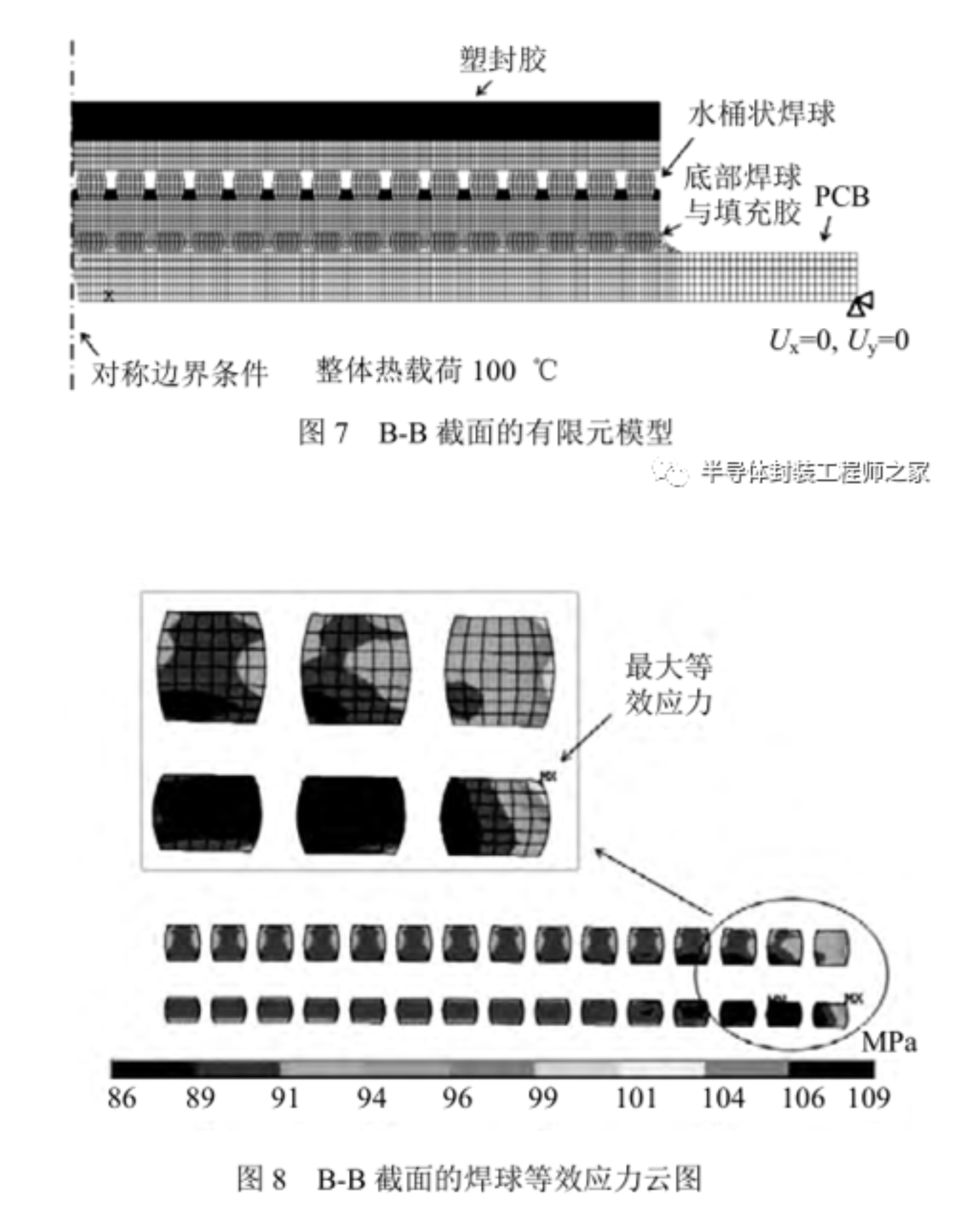 模型的材料属性见表1,B-B截面的有限元模型和边界条件见图7。焊球的等效应力云图见图8。通过图8上下两排焊球的应力对比可以发现,虽然最大等效应力出现在底部焊球与下层器件基底的交界处,但是以应力场整体的分布图来看,水桶状焊球(上排)的应力集中仍然比底部焊球(下排)严重。
