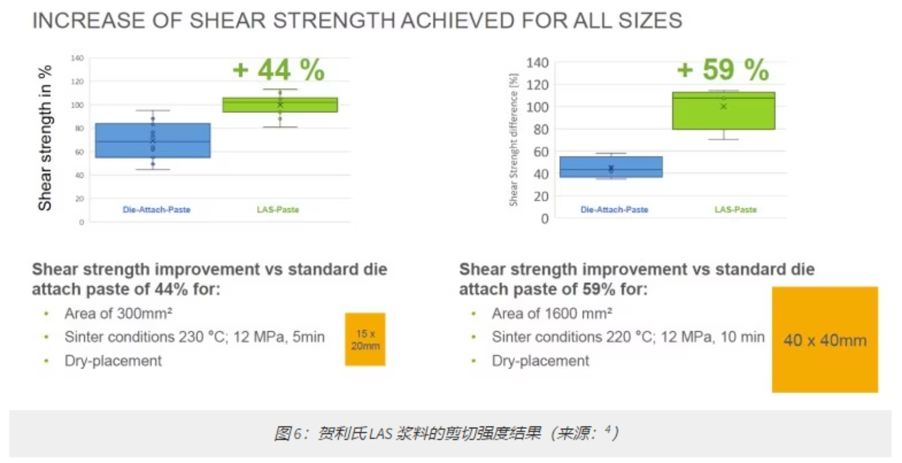 图 6 所示的剪切强度测试结果证明了 Ag LAS 流的成功优化。与标准芯片贴装银烧结浆料相比,LAS 浆料在测试的尺寸范围内提高了 40% 以上的剪切强度。