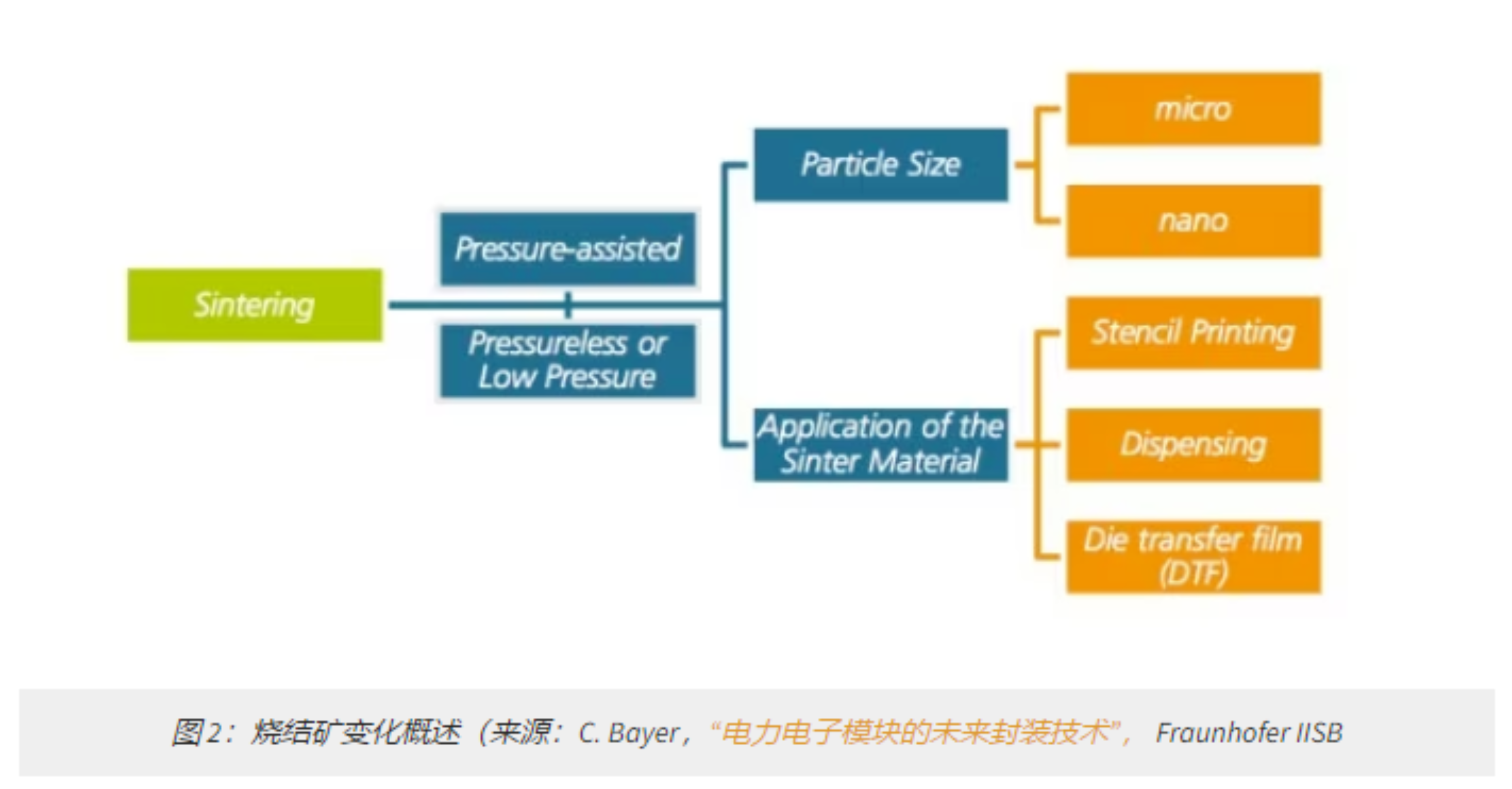 图 2 概述了烧结类型。压力辅助烧结对于 SiC 功率模块最为常见。随着烧结颗粒的尺寸从微米级减小到纳米级(即< 1μm),烧结温度和时间可以降低。纳米级压力可以在 5 至 15 MPa 范围内,温度从 200°C 至 300°C,时间从 1 至 10 分钟。