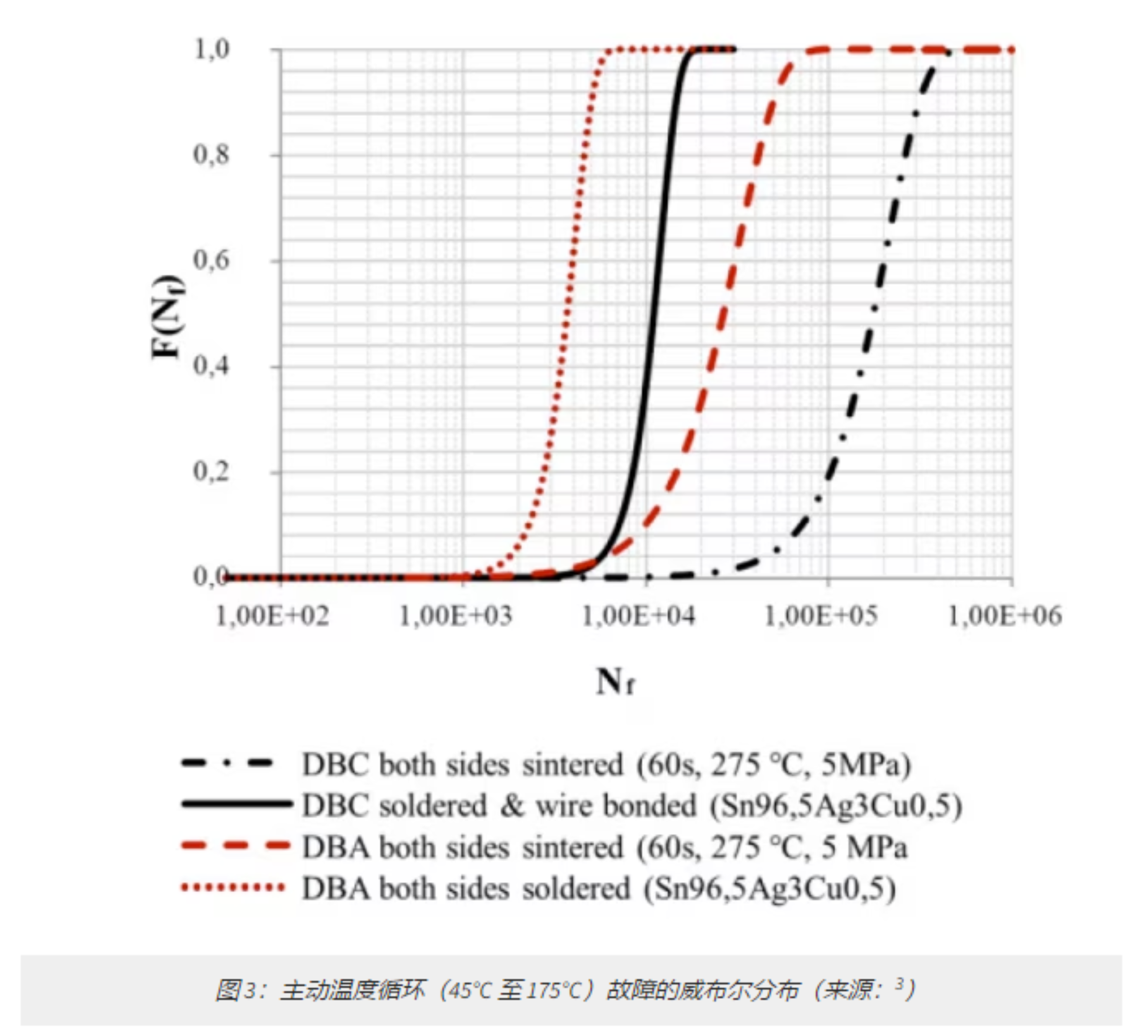 许多团队使用银烧结焊料显着改善了芯片贴装工艺的温度循环 (TCT) 和功率循环寿命。图 3 显示了这样的一个示例。在 DBC 基板上进行的主动温度循环测试中,寿命增加了 17。