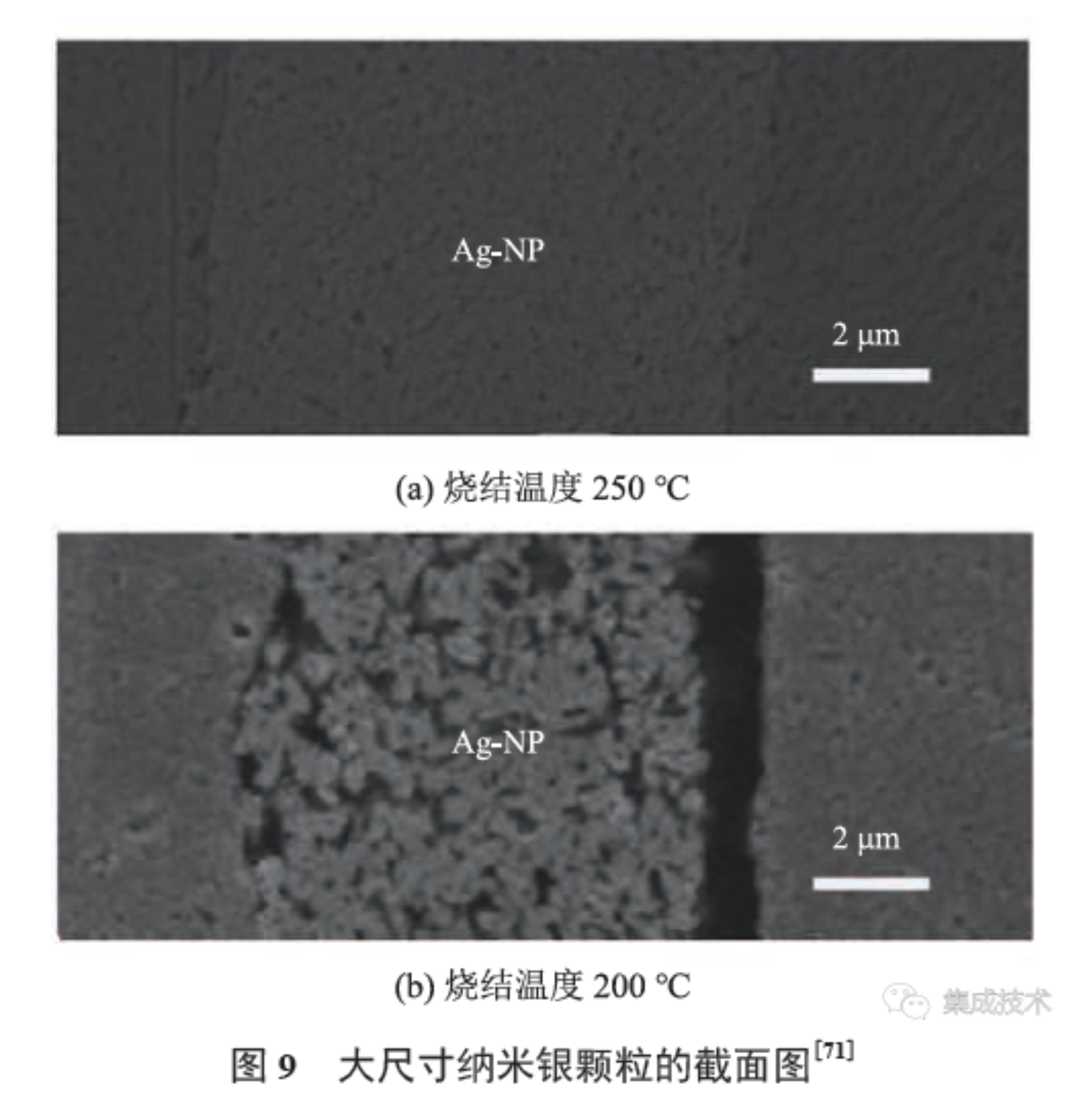 纳米银低温烧结技术起源于 20 世纪 80 年代末期,Schwarzbauer[51]利用商业烧结银膏将电子元器件与散热衬底焊接在一起,此外,还通过施加压力的方式来降低银膏的烧结温度。Göbl 等[52]、Amro 等[53]的研究表明,当施加 40 MPa 的压力时,焊接温度可降至 250 ℃,致密度可达 80%,银膏得到良好的热、电性能。然而,随着银颗粒的尺寸不断减小,颗粒间的团聚越来越严重。此外,银膏在烧结过程中可能会开裂。因此,除银纳米粒子外,银膏通常会添加分散剂、黏结剂和稀释剂等 3 种有机组分。分散剂可减少银纳米粒子的团聚;黏结剂可在一定程度上提高银纳米颗粒的结合力;稀释剂用于调节银膏流动性,适应不同的工况需求。有机溶剂虽有助于烧结,但在烧结中,完全排出较难,易产生孔洞(图 8)[54],因此,常需施加压力,减少烧结时产生的孔隙,并为烧结提供额外的驱动力。然而,半导体功率材料通常无法承受较高的应力,否则会使其出现开裂等情况,降低器件的成品率。实际上,目前的纳米银烧结方案因其高压需求,仅适用于尺寸小于 4 mm×4 mm 的烧结表面[55]。