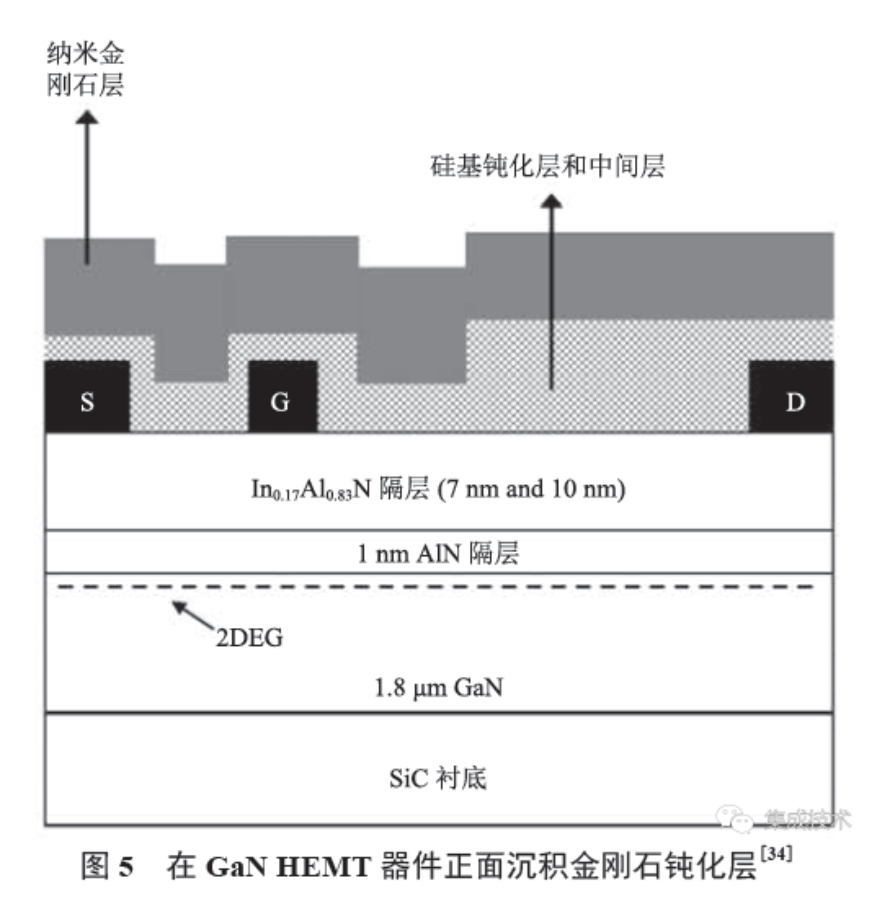 此外,在不改变原有衬底的基础上,直接在 GaN HEMT 器件正面沉积金刚石钝化层,可提高器件向上散热的能力,如图 5 所示。Alomari 等[34]在 750~800 ℃ 的生长温度范围内,在 In0.17Al0.83N/GaN HEMT 上系统地生长了一层厚度为 500 nm 的金刚石薄膜,并测得器件的最大截止频率为 5 GHz。此外,虽进行了金刚石的高温生长过程,但未观察到 HEMT 直流特性的退化或变化,证明二者的相容性良好。