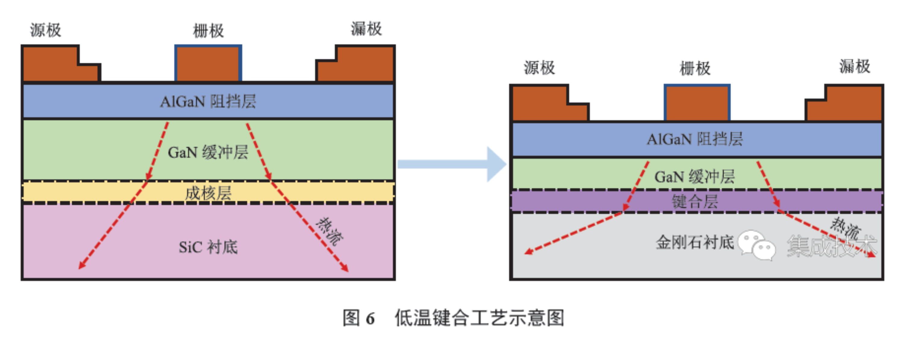 目前,金刚石基半导体器件工艺可在 300 ℃ 以下,甚至室温,进行器件的直接键合,大幅提高了半导体器件的散热能力。Chao 等于 2013 年首次报道了低温键合工艺,该工艺在 150 ℃ 以下实现了键合,最大限度地减少了不同材料之间热膨胀系数的不匹配[37-39]。如图 6 所示,在该方法中,GaN 缓冲层厚度减小,成核层被消除,SiC 衬底通过低温键合技术被高导热性的金刚石代替。通过这种设计使 GaN 器件的热源在金刚石衬底的 1 μm 内,显著降低了器件热阻。该研究以一层 SiN 作为结合界面层,其接触界面的热阻低至 2.5×10-9 m2·K·W-1 [40]。此外,南京电子器件研究所也开展了 GaN 外延层到金刚石衬底转移技术的研究,对永久键合的温度、压力、时间等工艺条件进行了优化,解决了键合层厚度变薄导致的键合质量差及转移后外延层脱落的问题,成功实现了 3 英寸(1 英寸=25.4 mm)GaN HEMT 的外延生长,以及将该器件完整转移至多晶金刚石衬底。通过连续波直流测试发现,GaN HEMT 转移到金刚石衬底上后,器件直流性能未发生明显退化,一定程度上说明了转移过程中的应力控制及键合界面热阻控制取得了成效[41]。