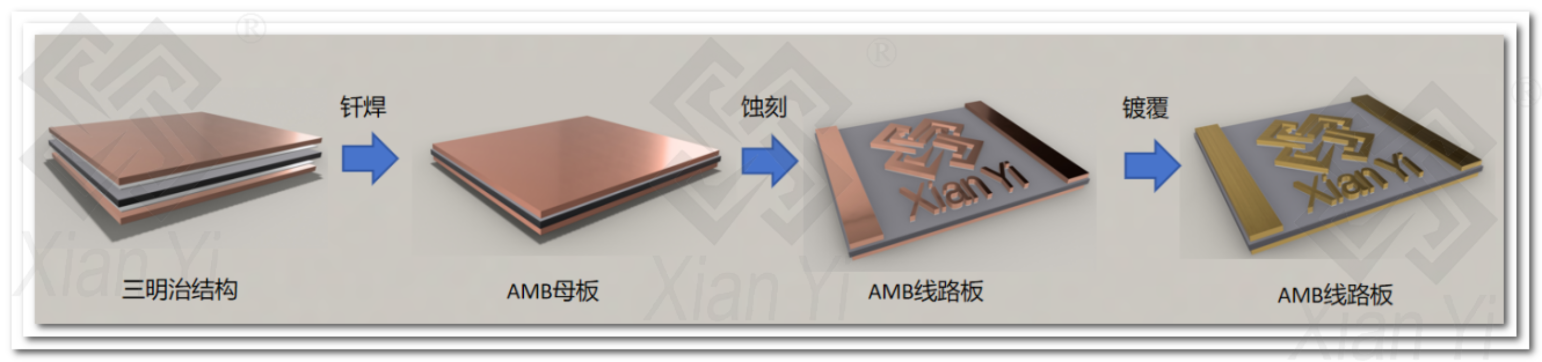 AMB活性金属钎焊覆铜工艺是DBC工艺技术的进一步发展,通过往钎料中添加少量能与陶瓷反应的活性元素得到能直接钎焊陶瓷的活性金属钎料,从而实现陶瓷与铜的钎焊接合。AMB的整个钎焊工艺过程与常规钎焊并无不同,包括组装“陶瓷/焊料/铜”的三明治结构、高温钎焊两个环节,重点在于所用的钎料以及大面积钎焊的工艺控制,得到AMB陶瓷覆铜板后再通过与PCB板类似的湿法蚀刻和镀覆工艺得到AMB陶瓷线路板。
