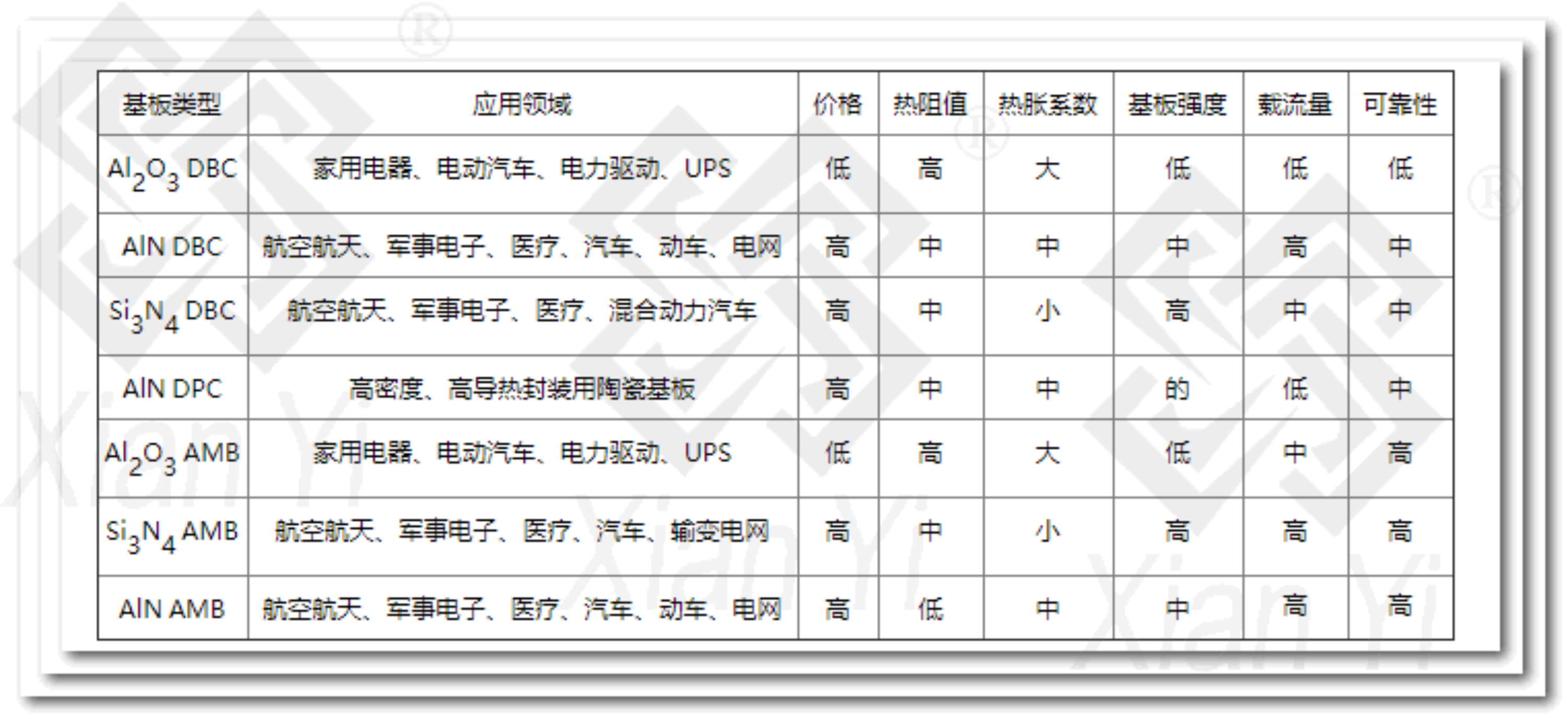 根据陶瓷材质的不同,目前成熟应用的AMB陶瓷基板可分为:氧化铝、氮化铝和氮化硅基板,根据不同陶瓷的性能、价格差异应用于不同的领域。