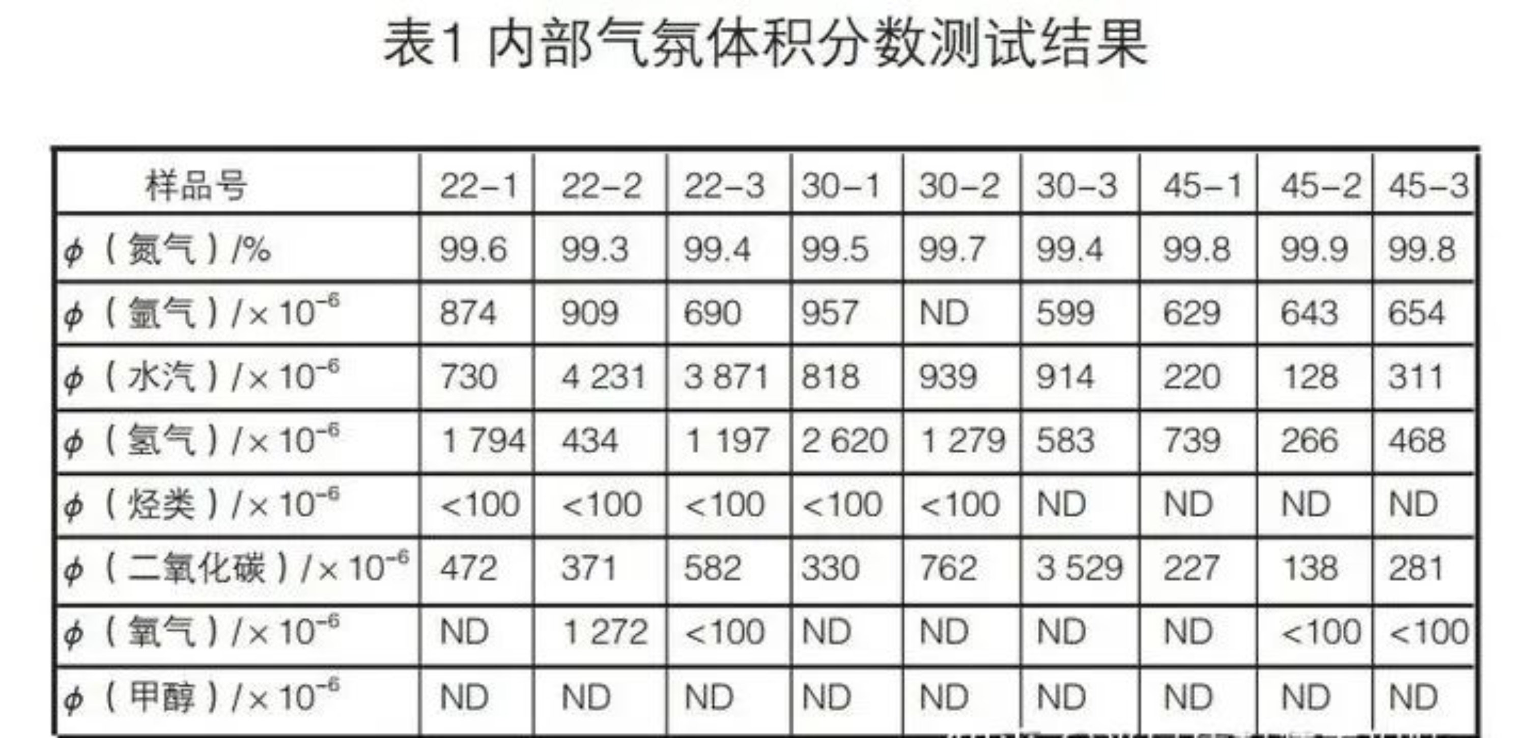 4.2 内部水汽含量检测从采用不同封焊程序的样品中各抽取3只共9只产品进行内部气氛含量测试,其结果见表1,从结果看所有样品均达到了GJB548方法1018的要求,水汽体积分数均小于5×10-3,其中封焊程序编号为45的样品其结果最为优良,证明我们完全可以通过程序设计控制内部水汽含量。