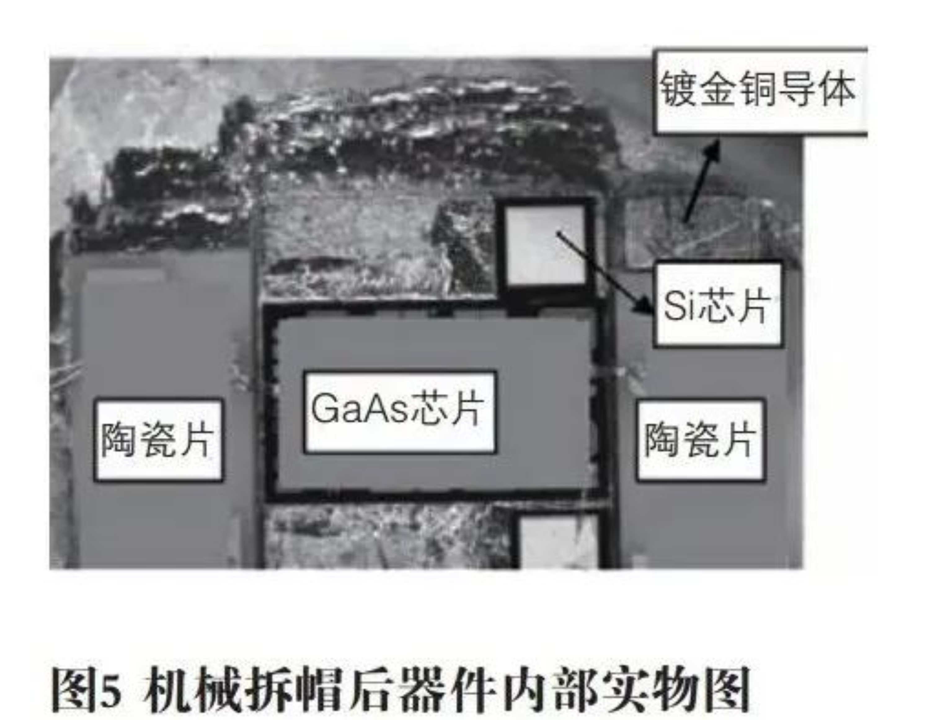 4.3 性能测试对40只样品进行了封帽前后性能测试对比,其驻波及增益的变化率均与平行封焊的变化率一致,说明采用倒置型装配的金锡封帽工艺对产品的性能没有影响。4.4 内部目检抽取5只产品机械开帽后,未发现一例金锡焊料重新熔化的现象,其金锡焊料仍保持芯片焊接后的形态,所有载体、GaAs芯片、Si芯片、陶瓷电路片和镀金铜导体均未出现偏移浮起现象,说明经焊后的金锡焊料的熔化温度大于封焊峰值温度。