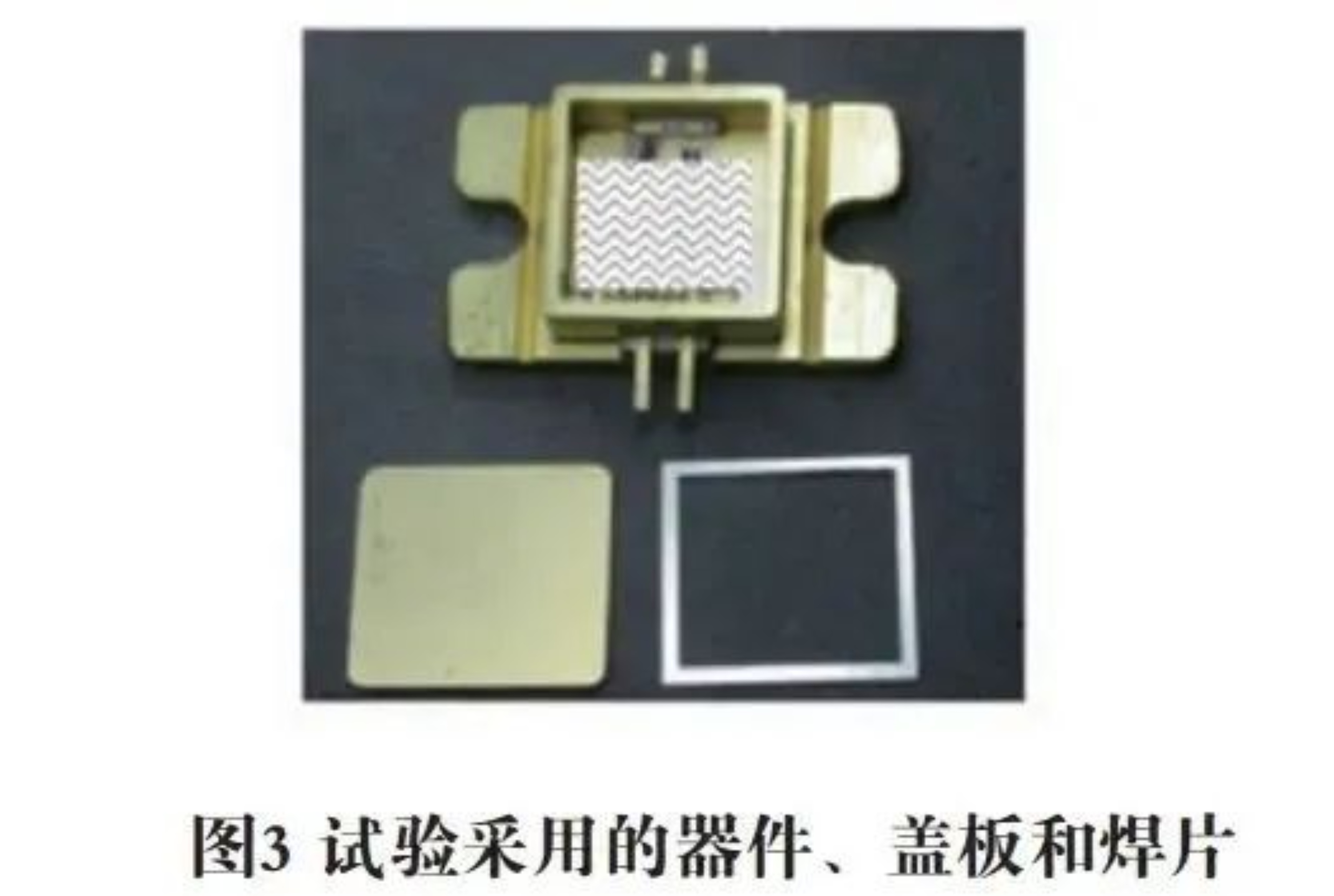 试验采用的器件壳体为可伐4J29,管口尺寸为11.4 mm×10.7 mm;盖板同样选用可伐4J29,尺寸为11.3 mm×10.6 mm×0.3 mm;Au80Sn20预成型焊片的选用与壳体及盖板的平整度是相互关联的,若壳体与盖板的金属表面很平整,焊料不需要很厚就能完全润湿,但当壳体与盖板之间存在缝隙时,就需要采用较厚的焊片才能实现气密性封装,通过反复测量及多次试验,最终选取了尺寸为11.300mm×10.600 mm×0.053 mm的合金焊片。