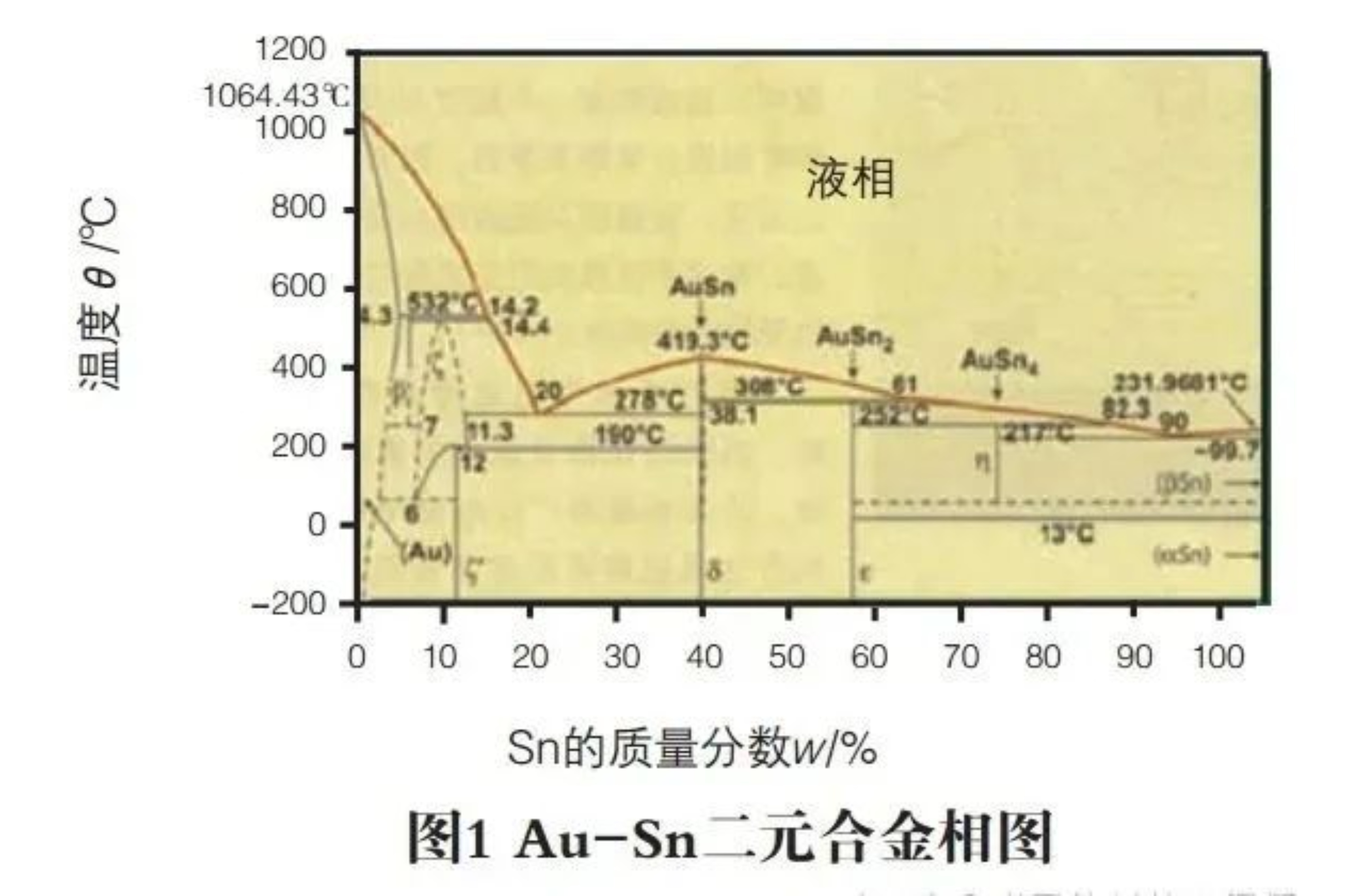 Au80Sn20合金具有良好的浸润性,而且对镀金层的浸蚀程度很低,同时也没有像银那样的迁徙现象;还具有高耐腐蚀性、高抗蠕变性和良好的导热和导电性[6],因此Au80Sn20焊料被广泛用于大功率电子器件的芯片焊接和高可靠电路的气密性封装。由于器件的芯片焊接和封装都采用了Au80Sn20焊料,国内很多厂商为避免内部芯片发生偏移、浮起和脱落等缺陷,封装时通常会采用器件正面朝上用钼夹固定的方式进行封焊。这种封焊方式不仅封焊成品率较低,而且定位和压力控制难度都较大。为此本文设计了倒置型装配的封焊工艺。图1[7]显示在Au-Sn系统中共晶体的富金一侧液相曲线斜度非常陡,在芯片焊接过程中,Au80Sn20焊料金含量的增加很容易通过芯片背面的电镀金发生快速溶解,金含量的增加会使焊料的温度迅速提高至320 ℃~360 ℃,而封焊的峰值温度不会超过320℃,因此不必担心倒置封焊过程中器件内的焊料发生重熔,导致芯片偏移、浮起和脱落等现象,从而影响产品的电性能。