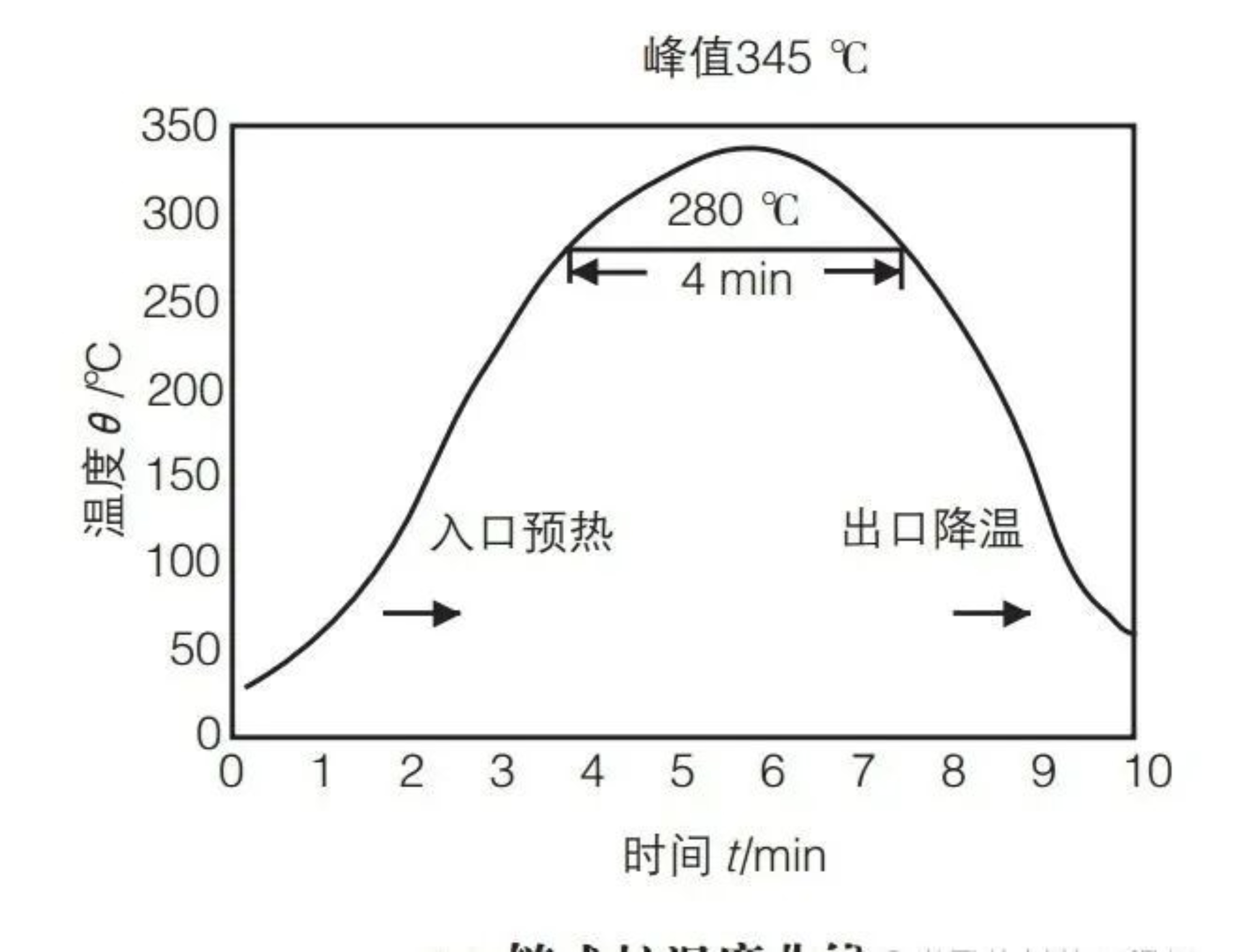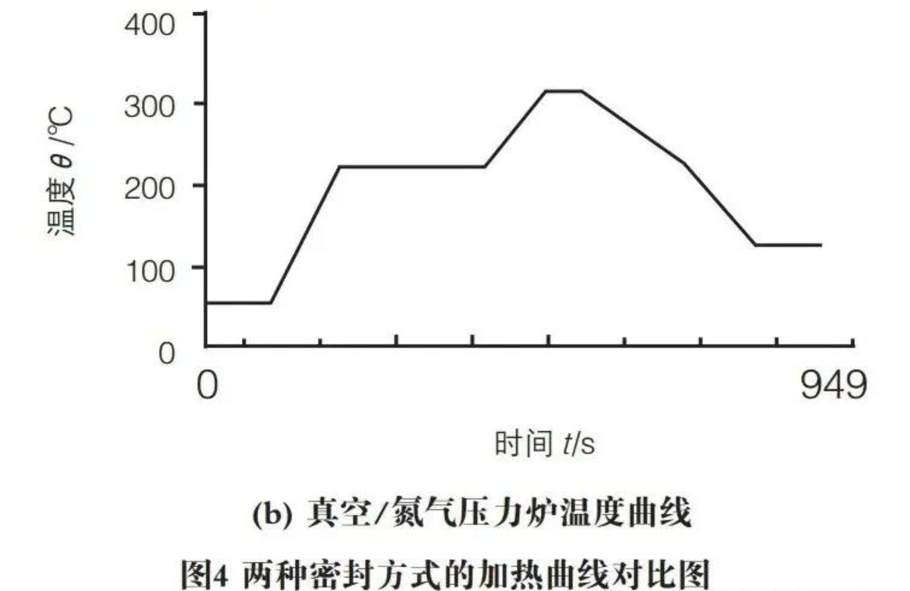 将器件、盖板和焊片分别在甲苯、丙酮和乙醇中超声清洗5 min,取出后用氮气吹干,以去除壳体表面污染。将盖板、焊片和器件依次放入定位夹具内,压入压针,放入真空炉内,经过抽真空、加热(加热曲线如图4所示)、加压和降温过程,完成整个密封过程。链式炉密封的典型加热周期包括快速预热期(3 min~5 min),液相温度以上的最短时间(3 min~5 min),高于熔融温度40 ℃~80 ℃的峰值温度,以及固化后的快速冷却。这种加热方式首先较难保证内部水汽含量,前期需要真空烘烤;其次其加热及冷却速率很难控制,易对内部芯片造成热冲击。在真空炉内进行密封不仅能够准确地控制加热曲线,而且可以在预热区就能进行真空烘烤,以保证内部气氛含量。