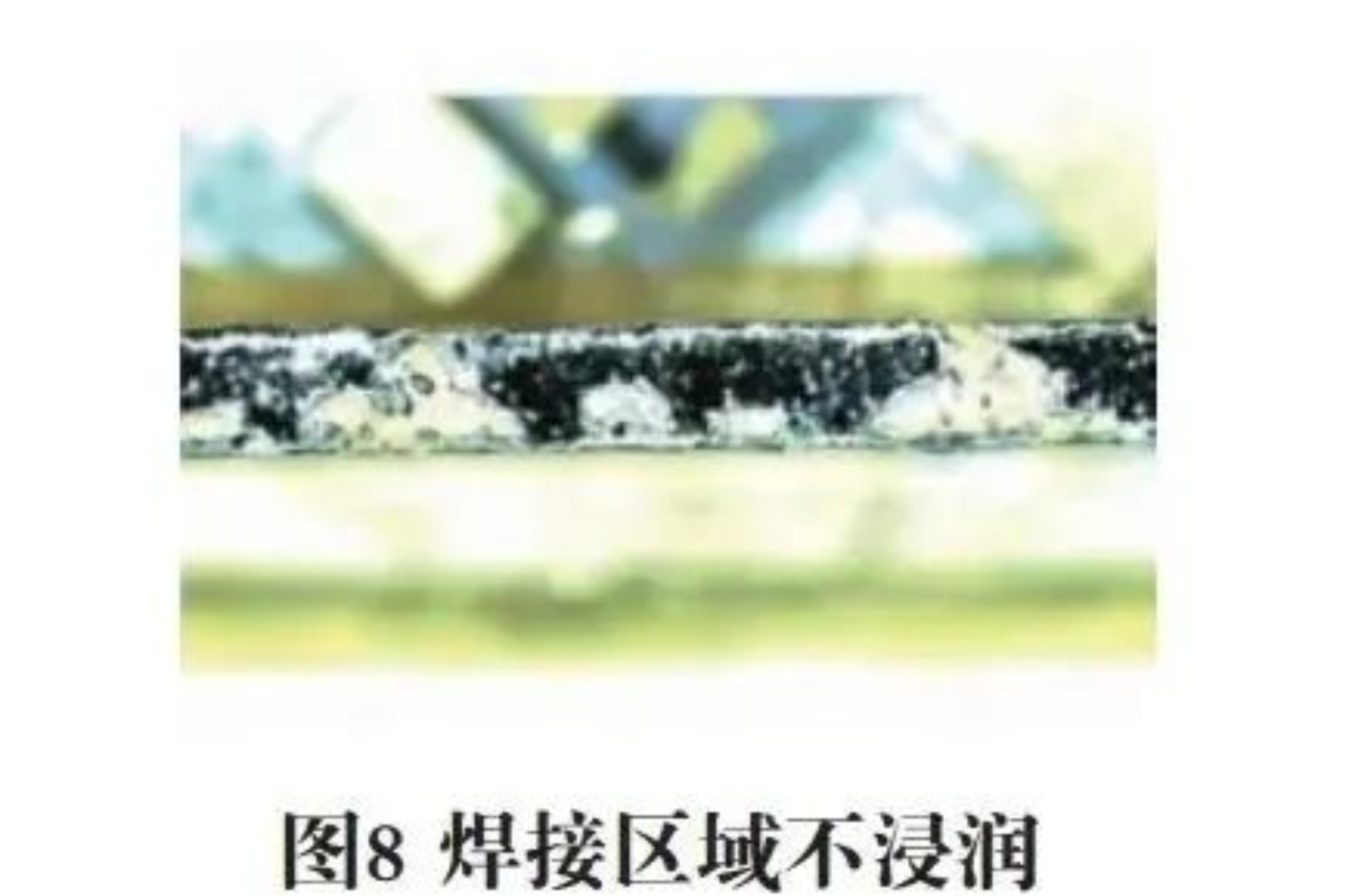 5.2 管口表面不浸润造成封焊后的产品漏气的最主要因素是管口表面不浸润,如图8所示,其造成的原因主要是管口不清洁,有树脂和油脂等有机物存在。在封焊之前必须经过超声清洗,在装配过程中也应杜绝用手去接触焊接区。