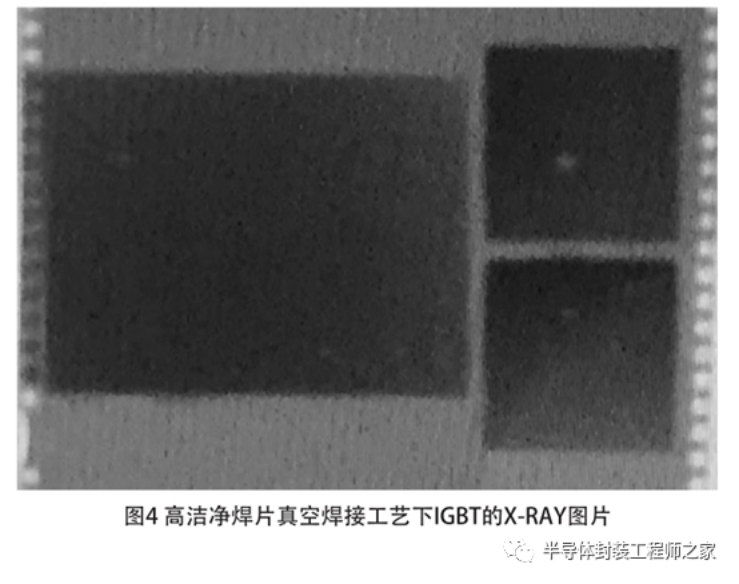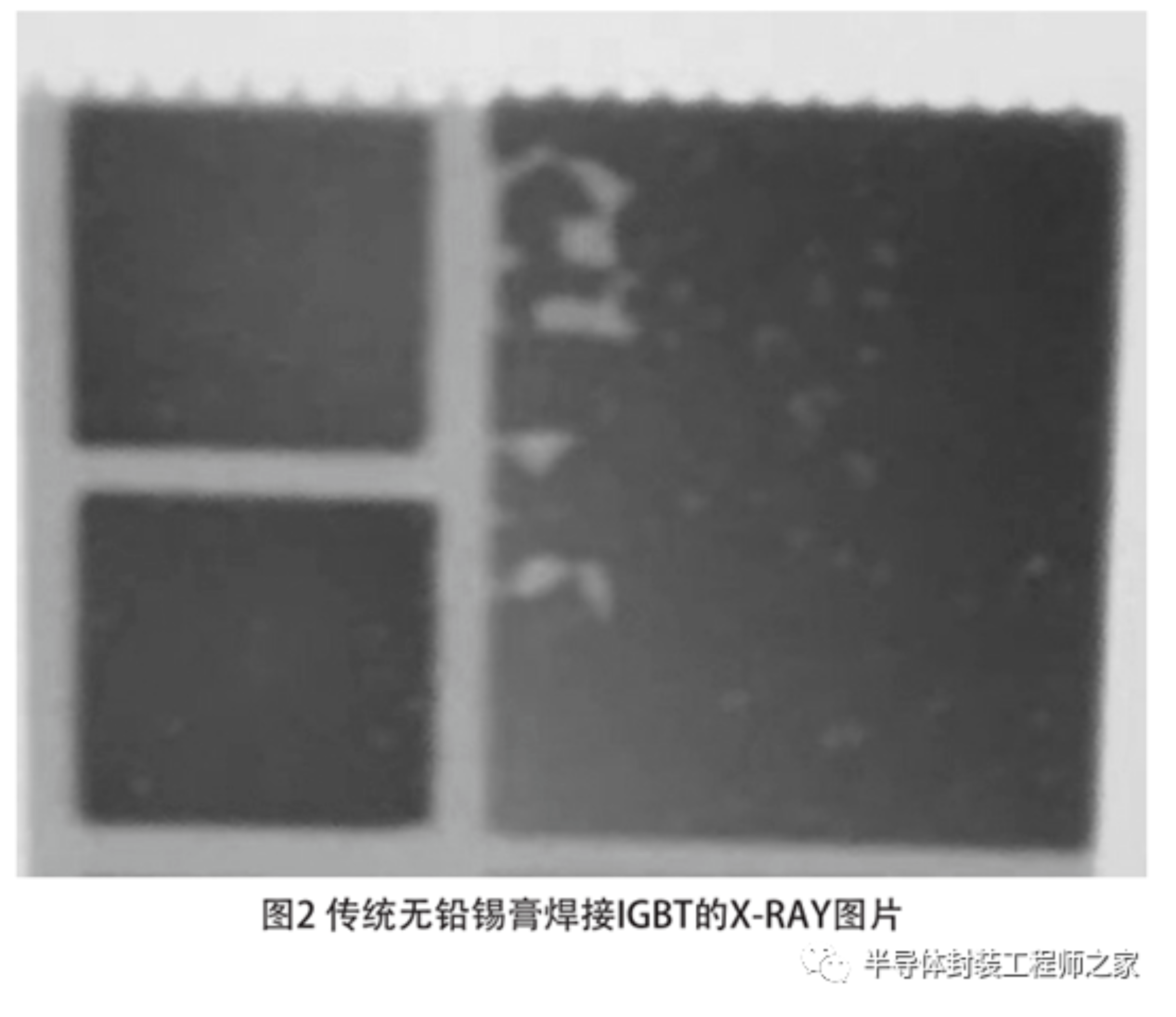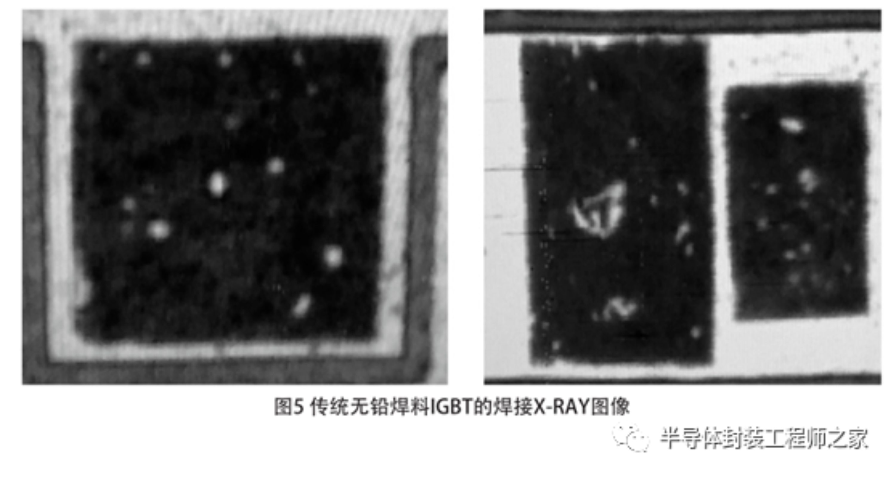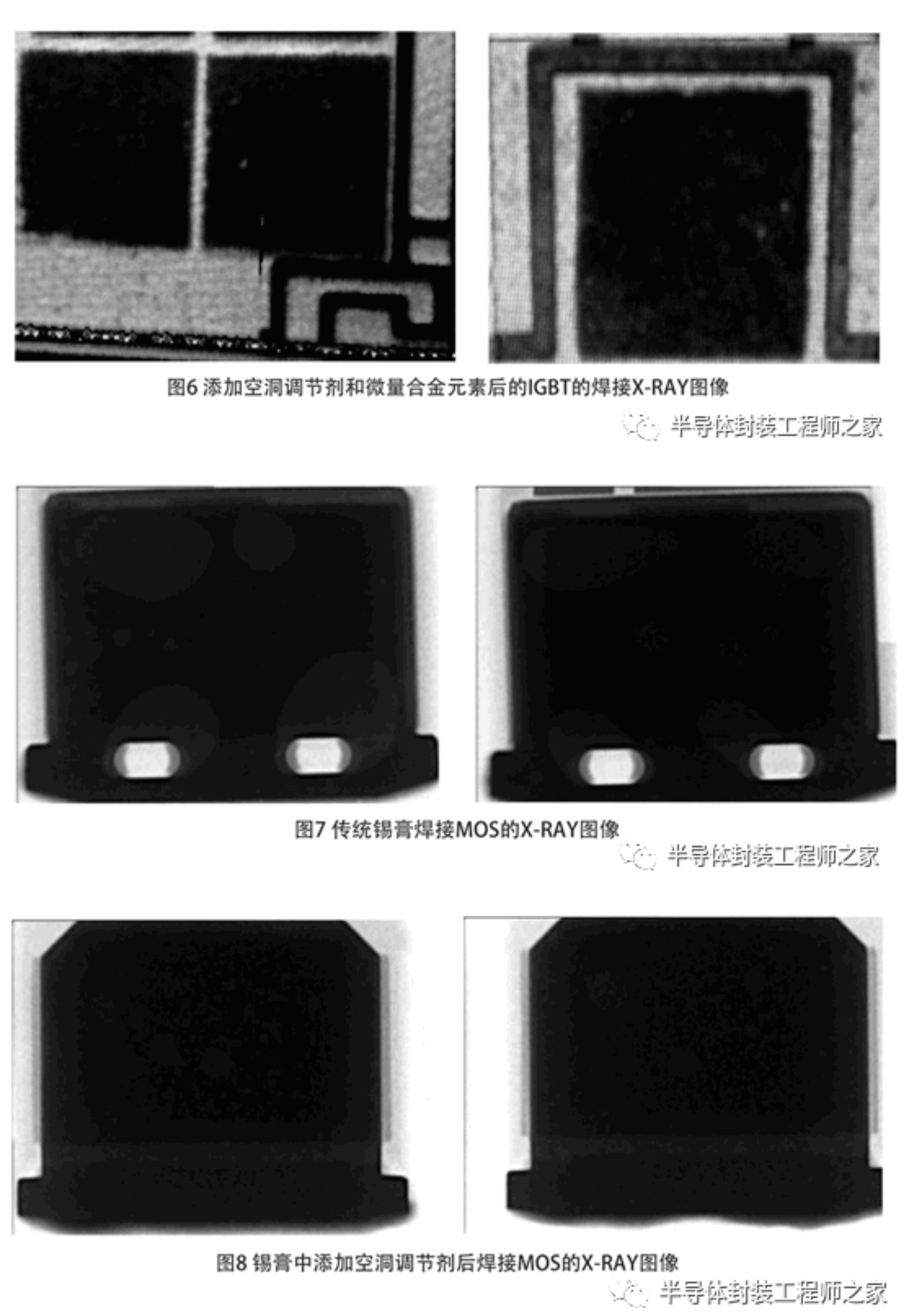 实验中,重点对助焊膏成分进行了优化,针对空洞改善,研究人员提出了添加一种空洞调节剂的方式。即添加一种酸酐类物质,其反应机理:与水发生化学反应,生成多元有机酸,生成的多元有机酸继续参与反应,去除焊料与被焊金属表面的氧化物,从而减少了水分对空洞的影响,焊接效果见图3(添加空洞调节剂后焊接IGBT的X-RAY图片),图2为图3的对比图片(传统无铅锡膏焊接IGBT的X-RAY图片),图4为高洁净焊片真空焊接工艺下IGBT的X-RAY图片;图6为同时添加空洞调节剂和微量合金元素后的IGBT的焊接X-RAY图像,图5是图6的对比图片;图8为锡膏中添加空洞调节剂后焊接MOS的X-RAY图像,图7为图8的对比图片。