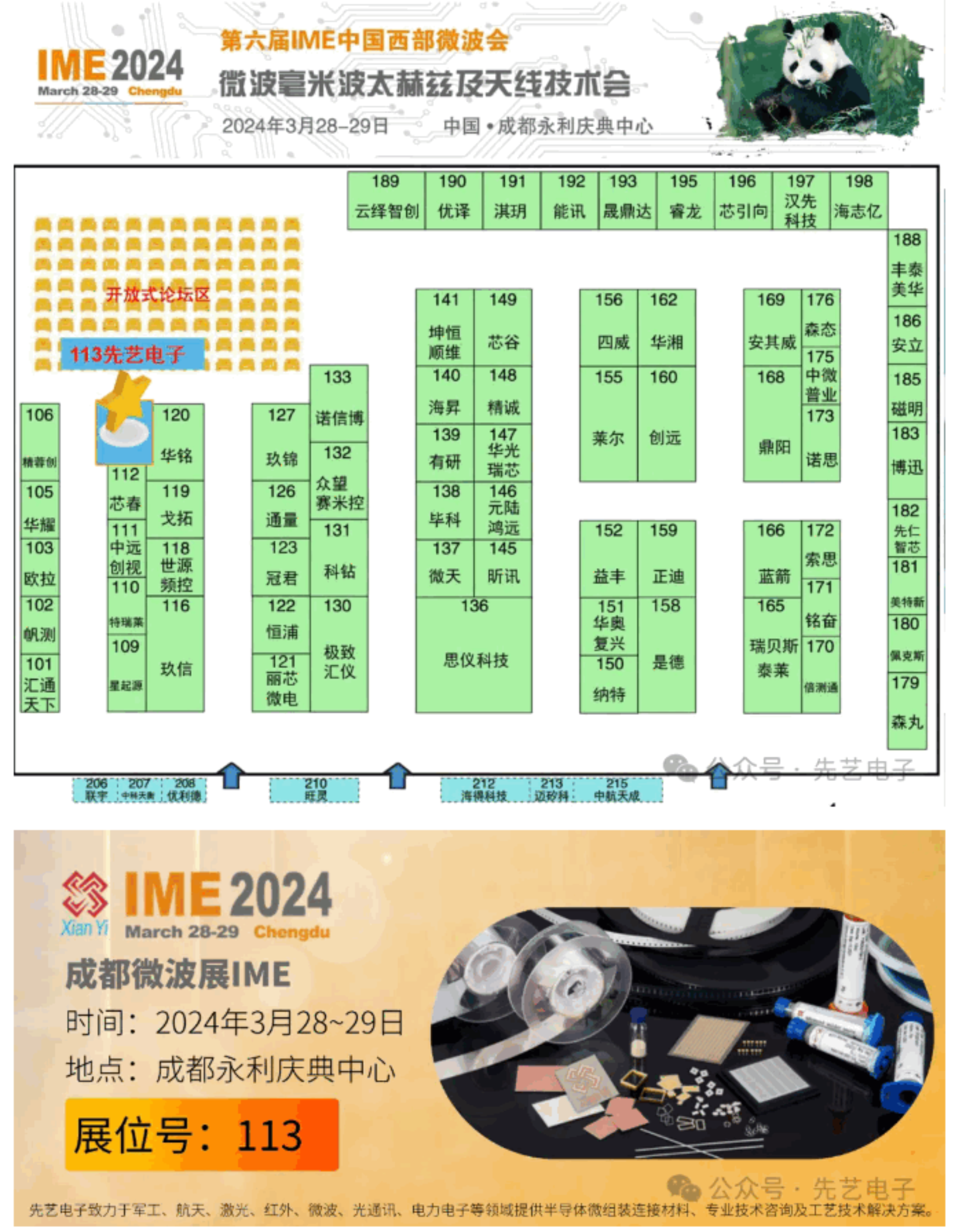 作为聚焦成都、服务西部地区微波及天线行业专业化展示交流平台,IME第六届西部微波会将吸引100余家领先企业,20多场技术会议同期火热开讲,探讨5G/6G、雷达、电子对抗、航空航天、卫星通信、导航、人工智能、物联网等领域的电磁场与微波、毫米波、太赫兹、天线、测试测量、集成电路、芯片设计、无线能量传输、封测与材料等热门话题,是不容错过的技术盛宴!先艺电子诚邀您来现场(成都永利庆典中心 展位号:113)和我们深度交流。