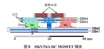CPES 针对 10kV 的 SiC MOSFET 采用了如图 8所示的封装设计。使用银烧结技术将芯片和敷铝陶瓷板(direct bonded aluminum,DBA)、钼片相连接。其中芯片下部采用两层 DBA 板叠加,并将中间层连接到母线中间电压,一方面可以减小板子边缘的场强,另一方面减小了桥臂中点对地的寄生电容,降低 EMI。该模块可以采用双面散热,也可将瓷片电容焊接在芯片上部 DBA 板上,减小回路寄生电感到小于 5nH。