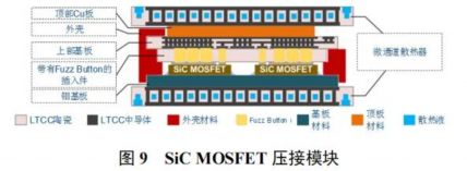 图 9 为浙江大学和阿肯色大学合作提出的一种用于 SiC MOSFET 的双面压接模块。该模块使用低温共烧陶瓷(LTCC)工艺和带有弹性的 Fuzz Button 取代传统 DBC 板和金属键合线实现芯片互联以及散热设计,回路寄生电感参数仅为 4.3nH。不足之处在于 LTCC 导热系数低,而且压接模块的特性对外部压力反应敏感。此外还有浙江大学与阿尔堡大学合作设计的直接通过螺钉固定的双面压接 SiC MOSFET 模块,也实现了低寄生电感参数和良好均匀的散热特性。