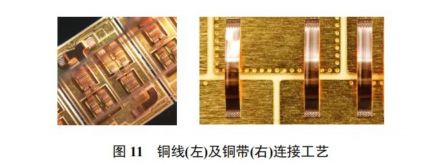 在进行芯片正面连接时可用铜线替代铝线,消除了键合线与 DBC 铜层之间的热膨胀系数差异,极大地提高模块工作的可靠性。此外,铝带、铜带连接工艺因其更大的截流能力、更好的功率循环以及散热能力,也有望为碳化硅提供更佳的解决方案。图 11 所示分别为铜键合线、铜带连接方式。
