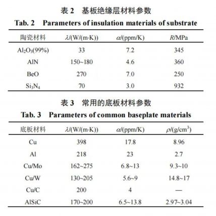 为提高陶瓷基板覆铜层的可靠性,覆铝陶瓷板(DBA)以及活性金属钎焊(active metal brazing,AMB)等工艺也受到人们越来越多的关注。如表 3所示,Cu 作为底板材料热导率最高,但其与基板之间热膨胀系数相差较大。