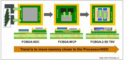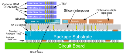 采用如此复杂的封装结构原因有很多,显示了2.5D封装的一些优点。为了满足运算速度不断提升的需求,内存与主芯片的物理距离越趋靠近。距离的减小意味着时间延迟的缩短和电子信号质量的优化,可实现更高速度,而且降低能耗。满足要求的硅介质层(Si Interposer)对接技术应运而生,封装技术进入到2.5D时代。