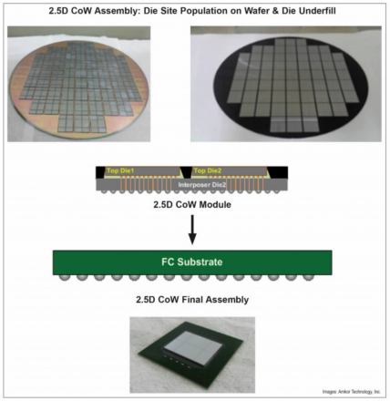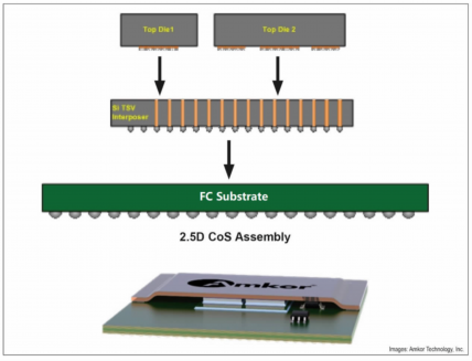 Amkor 已经开发出两种主要的2.5D封装平台,基板上芯片(Chip on Substrate,CoS)和晶圆上芯片(Chip on Wafer,CoW)。CoS 于 2014 年开发完成,并导入大规模生产。CoW 平台为新的升级结构制程,在 2018年开始大规模生产。