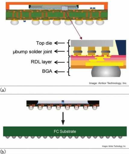 HDFO封装互连芯片(a),然后将中段组装产品贴合到基板(b)。图源:Amkor