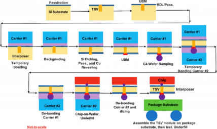 4. 临时键合:使用临时键合胶剂将TSV转换板(interposer)键合到载体carrier上。