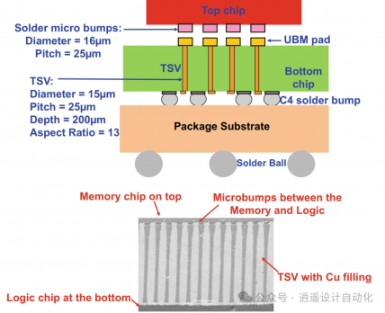 这种技术涉及垂直堆叠多个芯片并使用微凸点和TSV连接它们。顶部芯片使用微凸点连接到底部芯片(带有TSV),整个模块使用C4凸点附着到封装基板上。