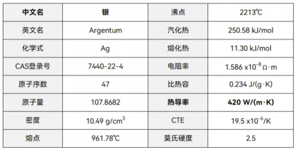 银(Silver, Ag),原子序数为47,属IB族金属元素,是过渡性银白色金属,银晶体的晶胞为面心立方晶胞,每个品胞含有4个金属原子。银原子量为107.8682,密度为10.53g/cm3,熔点为961.78℃,沸点为2213℃,熔解热为11.30kJ/mol,反射率为91%,莫氏硬度为2.5。银有很好柔韧性和延展性,延展性仅次于金,能压成薄片,拉成细丝。银是导电性和导热性最好的金属,室温热导率约为420W/(m·K),电阻率为1.586x10-8Ω·m。