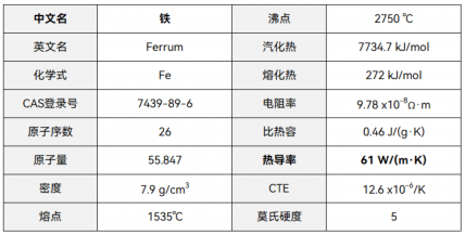 铁(Iron, Fe),原子序数为26,原子量为55.847,密度为7.9g/cm3,比热容为0.46J/(g·k),熔点为1535℃,沸点为2750℃,电离能为7.870eV,热导率约61W/(m·K),是最常见的第Ⅷ副族过渡金属。
