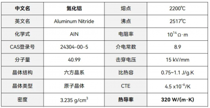 AIN具有优良电绝缘和高导热特性,常用作高功率集成电路基片和包装材料,是一种具有广泛应用前途的高导热填料粒子。AIN的热导率(约为320W/(m·K)),是所有陶瓷中导热率仅次于氧化铍;低热膨胀系数,CTE (4.5x10-6/K)与Si ((3.5~4)x10-6/K)匹配,因此常用作硅加工的衬底材料;较高的介电常数,约为8.8-8.9(纯AlN),与Al2O3相近,但远低于SiC。