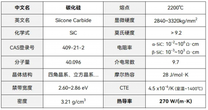 SiC的密度为3.20~3.25g/cm3,显微硬度为2840~3320kg/mm2,摩尔热容为27.69~28.63J/mol·K,熔点为2200℃,2700℃升华分解,在室温至1400℃之间的平均CTE为4.5x10-6/℃,热导率约为270W/(m·K)。碳化硅的热导率显著高于硅和砷化镓,尤其是在室温至高温范围内,这使其在需要高效散热的电子器件中具有优势。