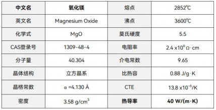氧化镁(Magnesium Oxide,MgO),为白色或淡黄色粉末;分子量为40.30,密度为3.58g/cm3,熔点为2852℃,沸点为3600℃,无臭、无味。MgO分轻质和重质两种,有高度耐火和绝缘性能,1000℃以上高温灼烧转变为晶体,至1500℃以上成烧结MgO。单晶氧化镁是指MgO含量在99.95%以上,具有极强耐高低温(高温为2500℃,低温为-270℃)、抗腐蚀性、绝缘性和良好的导热性和光学性能,是无色透明的晶体,CTE为13.8x10-6/℃(25℃),导热率约为40W/(m·K) (25℃),比热为0.88J/g℃,莫氏硬度为5.5。