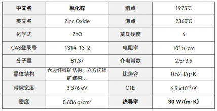 氧化锌晶体有三种结构:六边纤锌矿结构、立方闪锌矿结构和比较罕见的氯化钠式八面体结构。ZnO是一种半导体材料,室温下禁带宽度为3.3eV,属直接跃迁型能带结构,高能带隙使其具有击穿电压高。氧化锌电子噪声小、可承受功率高、抑烟、热稳定性和热传导性较好。晶体的对称性质使得纤锌矿结构具有压电效应和焦热点效应,闪锌矿结构具有压电效应。