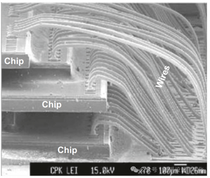 1. 键合:多个芯片堆叠并使用周边的键合线连接。这是成熟的低成本方法,广泛用于内存堆叠(图1和2)。
