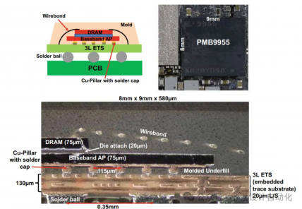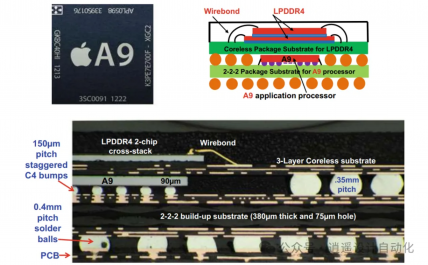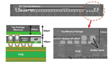 5. 封装叠加封装(PoP): 单独的封装垂直堆叠,通常底部是应用处理器,顶部是内存(图6)。
