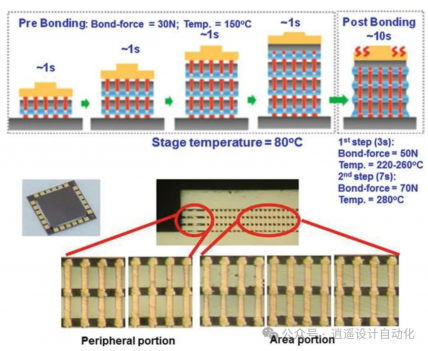 带TSV的3D堆叠组装通常使用热压键合(TCB)和铜柱微凸点。通常使用非导电薄膜(NCF)或浆料(NCP)作为底填以提高可靠性。对于HBM堆叠,芯片逐个键合,可能限制产量。为解决这个问题,已开发出同时键合多个芯片的集体键合方法(图11)。