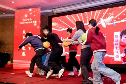 为活跃现场气氛、增强团队凝聚力,趣味游戏互动环节必不可少。联欢晚会上,各团队紧密协作,迅速完成相关挑战,现场加油声、欢呼声此起彼伏,完美展现了先艺员工团结协作、奋勇拼搏的精神风貌。