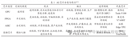 按照技术架构分类,AI 芯片可分为GPU、FPGA、ASIC 和类脑芯片,4 种芯片的特点如表 1 所示。