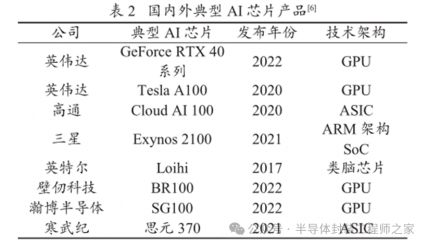 目前,我国在高端通用芯片领域与国外先进水平相比仍存在一定差距。部分自主研发的芯片仍需借助国外成熟的 ARM 架构和 IP 核等技术进行设计,自研能力相对较弱。不过人工智能技术在诸如安全防范、自动化驾驶、智能设备等行业的广泛使用进一步催生了国产 AI 芯片的崛起,我国一些新兴企业,如寒武纪、壁仞科技、云天励飞、瀚博半导体等,也开始研发出具有自身特点的 AI 芯片。国内外典型 AI 芯片产品如表 2 所示。