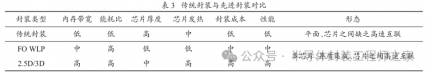 封装技术的发展史大致分为 4 个阶段:第 1 阶段(1970 年以前)是元件插装时代,主要采用直插型封装(DIP)等技术,电子元件被手工插入电路板的孔中,尺寸较大且制造过程相对简单;第 2 阶段(1970—1990年)是表面贴装时代,主要采用小外形封装(SOP)等技术,元件开始直接贴装在印刷电路板表面,从而实现更紧凑的设计;第 3 阶段(1990—2000 年)是面积阵列封装时代,主要采用球栅阵列封装(BGA)、倒装芯片等技术,这些封装技术进一步提高了芯片的集成度和性能,同时增强了电路板对热应力和机械应力的抵抗能力;第 4 阶段是 2000 年以来的先进封装时代,特点是采用堆叠、异构集成、精密互连等技术。传统封装与先进封装 (以 2.5D/3D 和 FO-WLP 为例)对比如表 3所示。