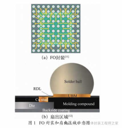 FO 封装的设计原理是芯片焊盘通过“扇出”的方式从芯片的边缘通过 RDL 和焊锡球连接到 PCB 上[10]。图 1 为 FO 封装和扇出区域示意图,RDL工艺让芯片可以使用的布线区域增加,充分利用芯片的有效面积,达到降低成本的目的。FO 封装技术完成芯片焊球连接后,芯片无需使用封装载板便可焊接到 PCB 上,这样有助于缩短信号传输距离,提高电学性能。